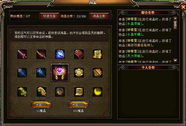 在淘晶界面可以选择一次使用10魔晶淘晶1次,或者一次使用450魔晶淘晶50次。淘到稀有物品的时候,会对中奖者进行全服公告。