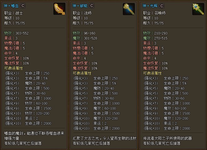 神之积分武器匣打开后根据职业获得相应神之积分武器一把,神•嗜血、神•破晓和神•光辉比同阶的嗜血、破晓、光辉属性更强,并且佩戴等级只需要10级。神•嗜血、神•破晓和神•光辉同样可以升级,佩戴升级之后的神之积分武器将拥有凤凰环绕特效。