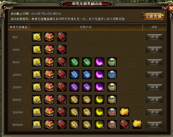 如:5次单笔充值1000魔晶,可领取5个1000魔晶档次的礼包。